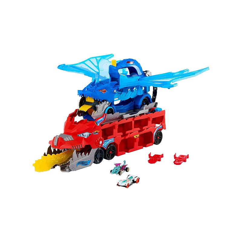 Hot Wheels Ultimate Dual Dragon Transporter doubles the action of dragons with two dragons who eat, launch, run and store Hot Wheels cars.