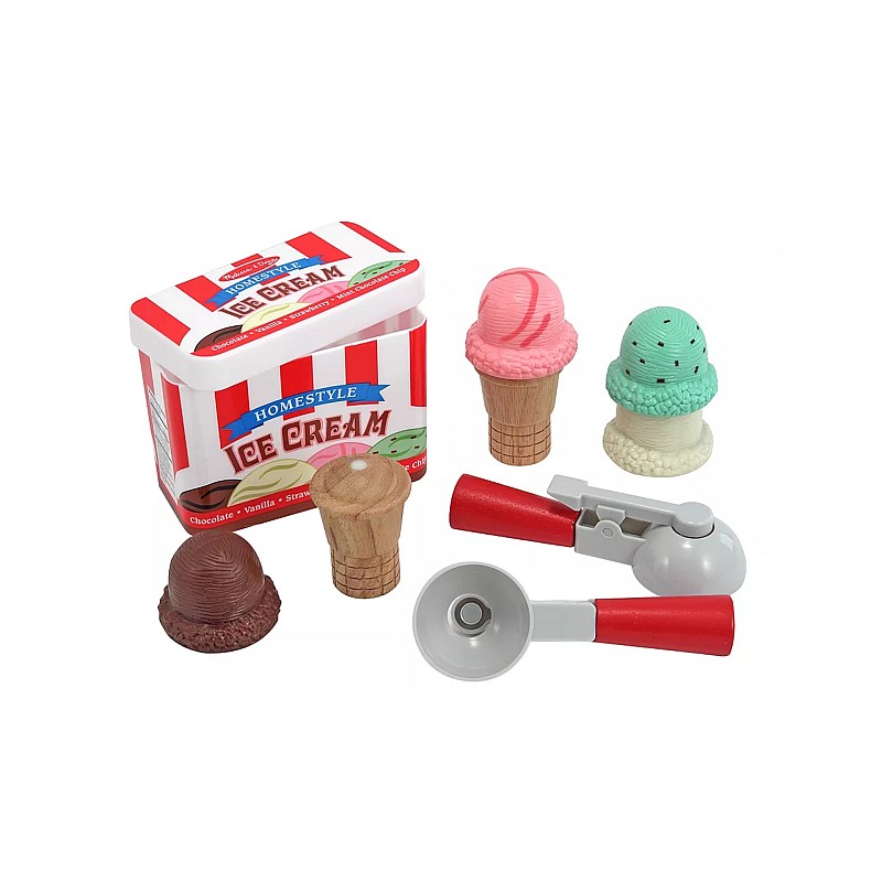 The magnetic play set includes 4 magnetic ice cream scoops, 2 cones, a magnetic scooper, an ice cream tub with lid for storing play pieces.