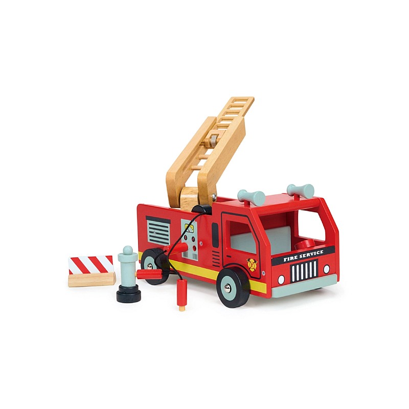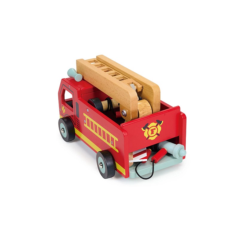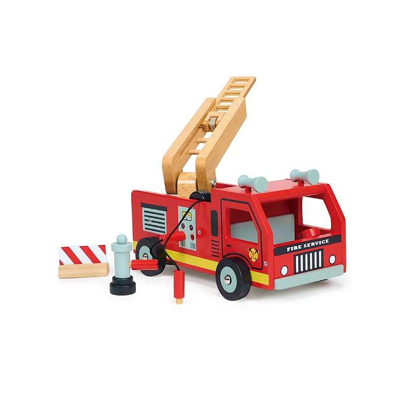 This wooden fire engine has a natural wood extendable ladder, a hose cord winding mechanism and an emergency barrier.