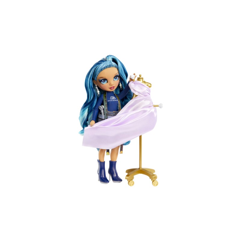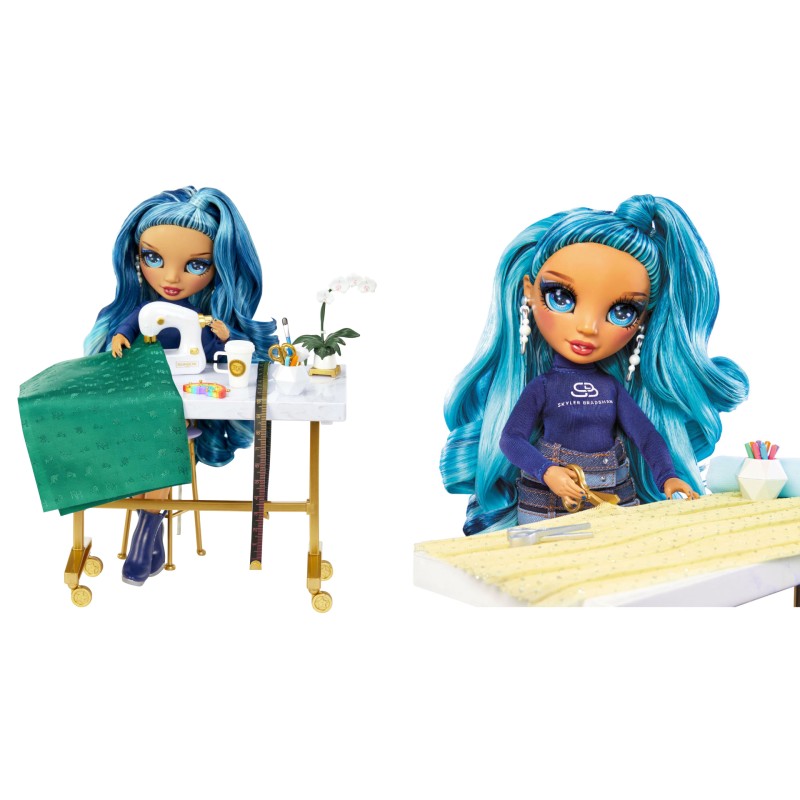 It comes with all the essentials: sewing machine, iron, fashion work table, water-revealing sketchbook, working mannequin, real-color Rainbow High fabrics and an exclusive Skyler Madison doll.