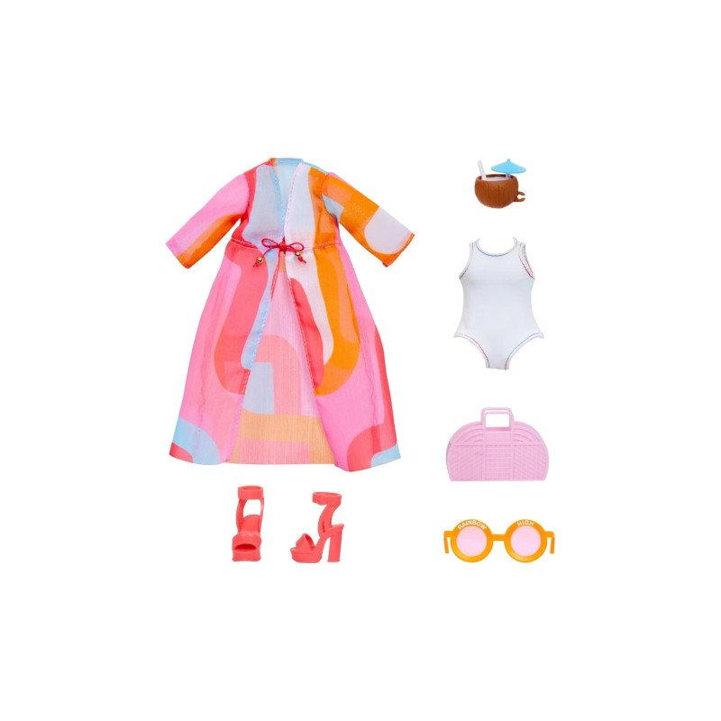 The fashion pack includes a swimsuit, colorful patterned cover-up, pink heels, pink bag, rainbow sunglasses and a coconut drink.