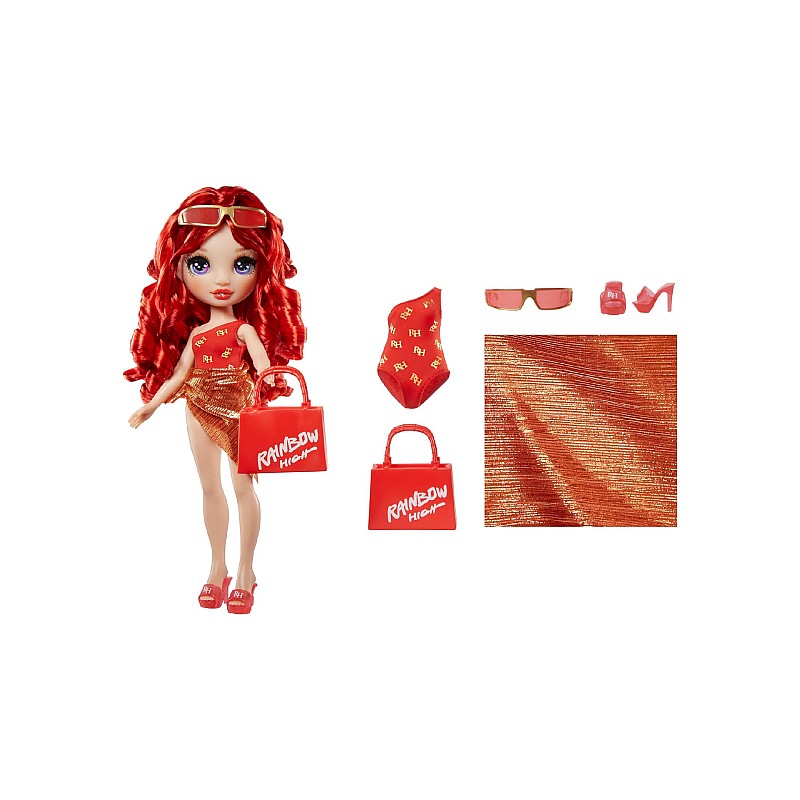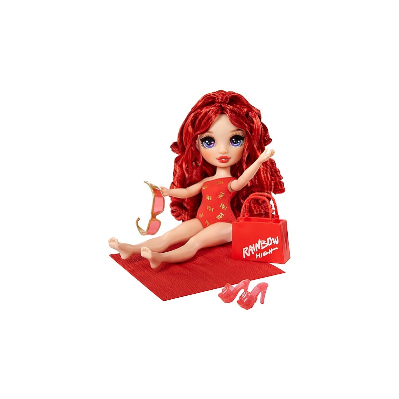 Ruby is ready for a fun day with friends in her adorable red one shoulder swimsuit, matching red sandals, sunglasses and handbag, great for the pool, for playing in the bath.