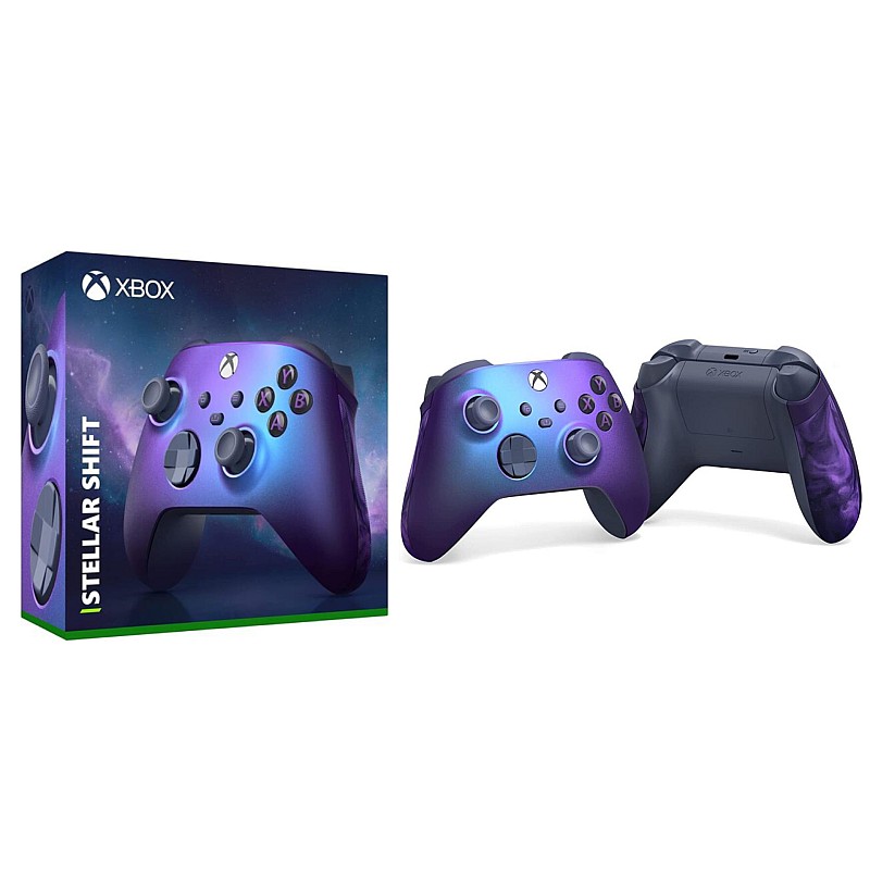 The Xbox Wireless Controller - Stellar Shift Special Edition features surreal blue-purple glow and color shifts and rubber grips with purple swirls.