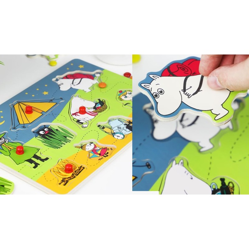 Nine wooden puzzle pieces with a camping theme and beloved Moomin characters, the pieces come with plastic nails.