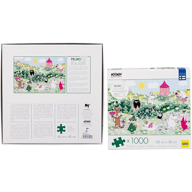 The Moomin floral themed puzzle features a print of Moomin characters enjoying a lush garden with flowers.