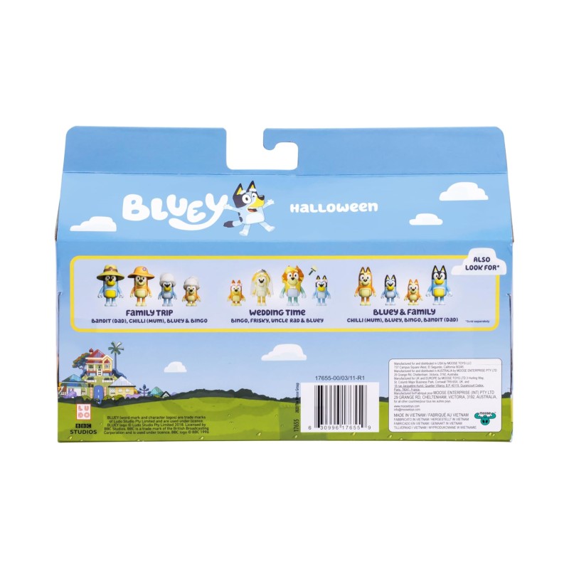 The Bluey set is confident for fans of the beloved animated series Bluey. It includes 4 details details, representing the main characters dressed in funny and colorful Halloween costumes.
