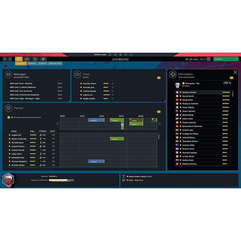 All major aspects of building a winning team are present: race management, rider rotation, training sessions, recruiting young talent, upgrading equipment, defining race strategies.