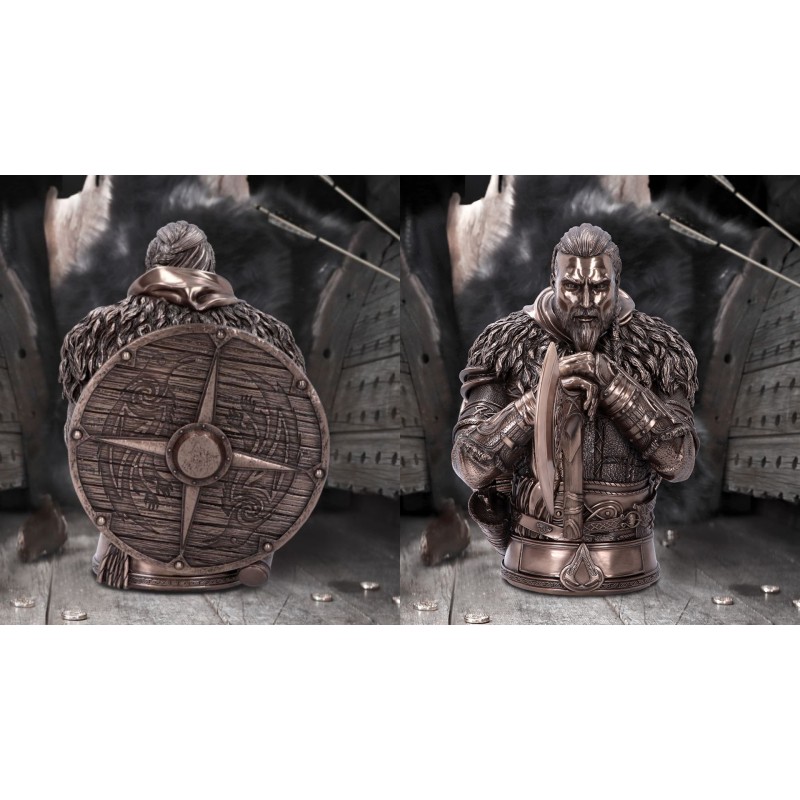 On the back of the bust, Eivor's Raven Clan shield can be seen.