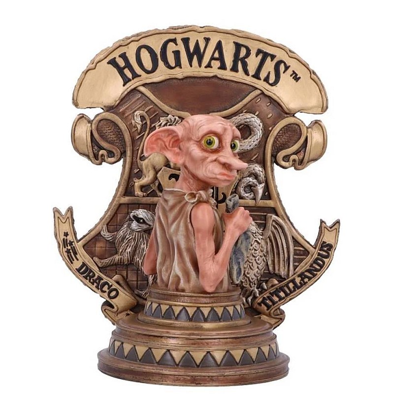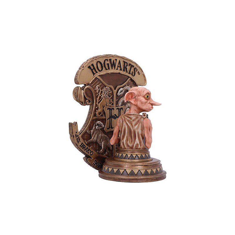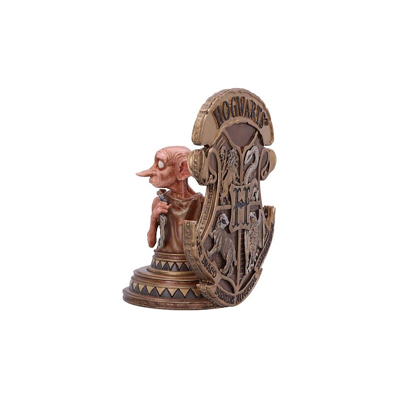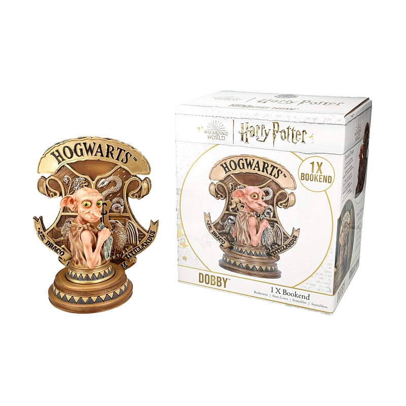 Standing in front of the instantly recognizable Hogwarts crest as the bookend's main feature, Dobby can be seen looking over his shoulder.