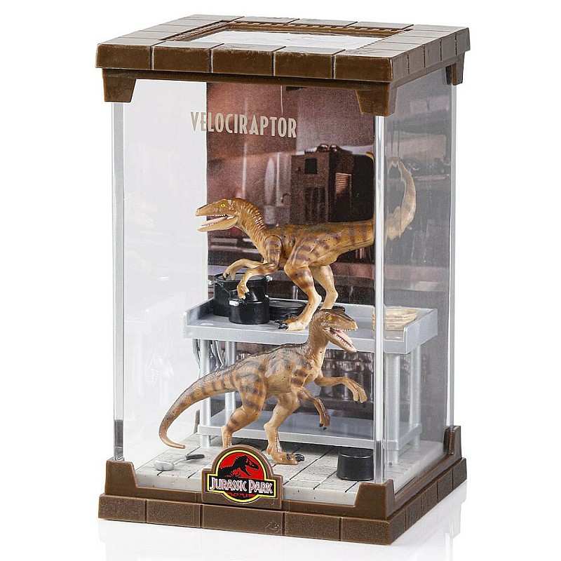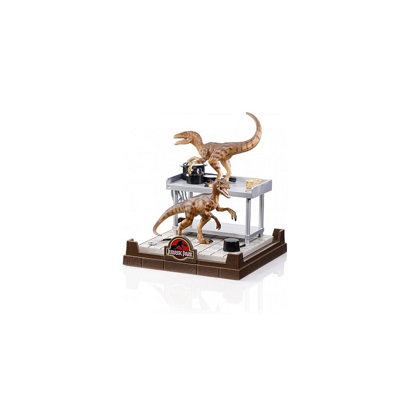 This spectacular diorama recreates the famous scene in the kitchen where two Velociraptors harassed Lex and Tim.