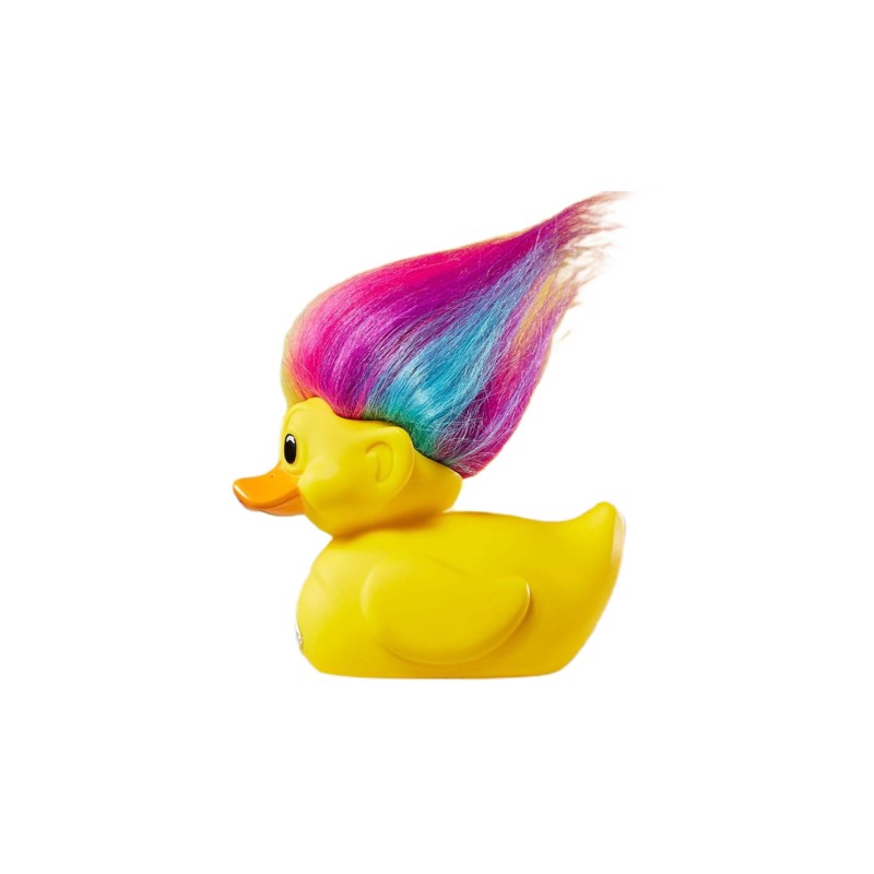 This is a troll with hair colored in vibrant rainbow hues in an adorable and funny plastic duck-like shape.