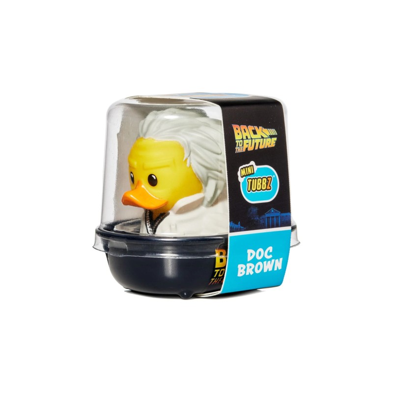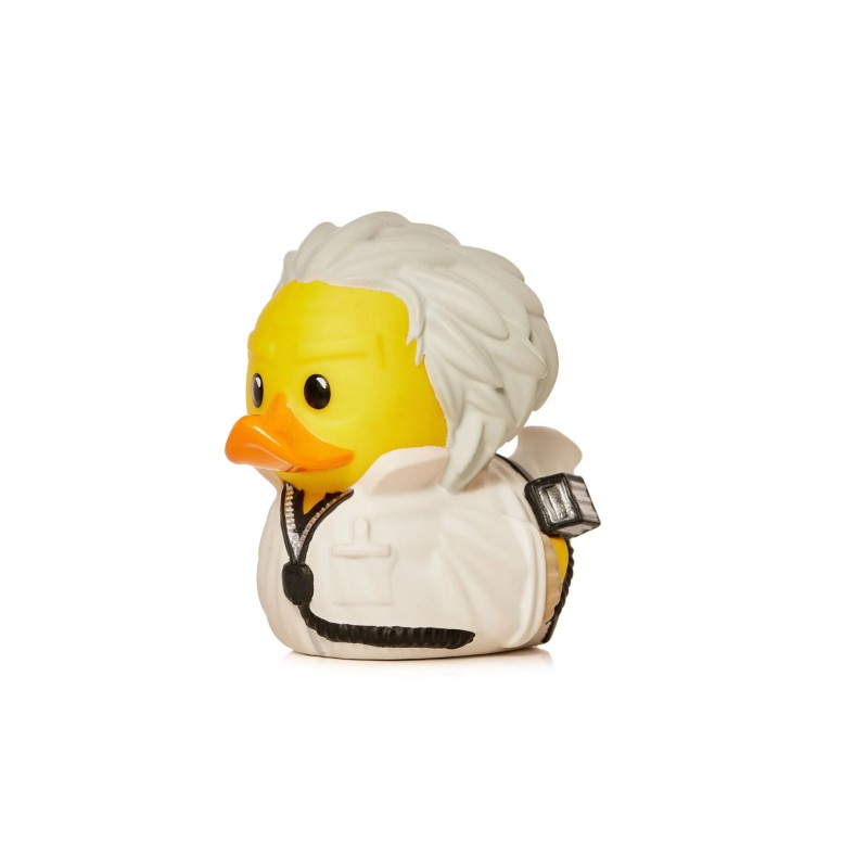 Doc Brown is transformed into a TUBBZ duck, wearing the iconic white scientist coat and his signature glasses, specific to when he's working on inventions.