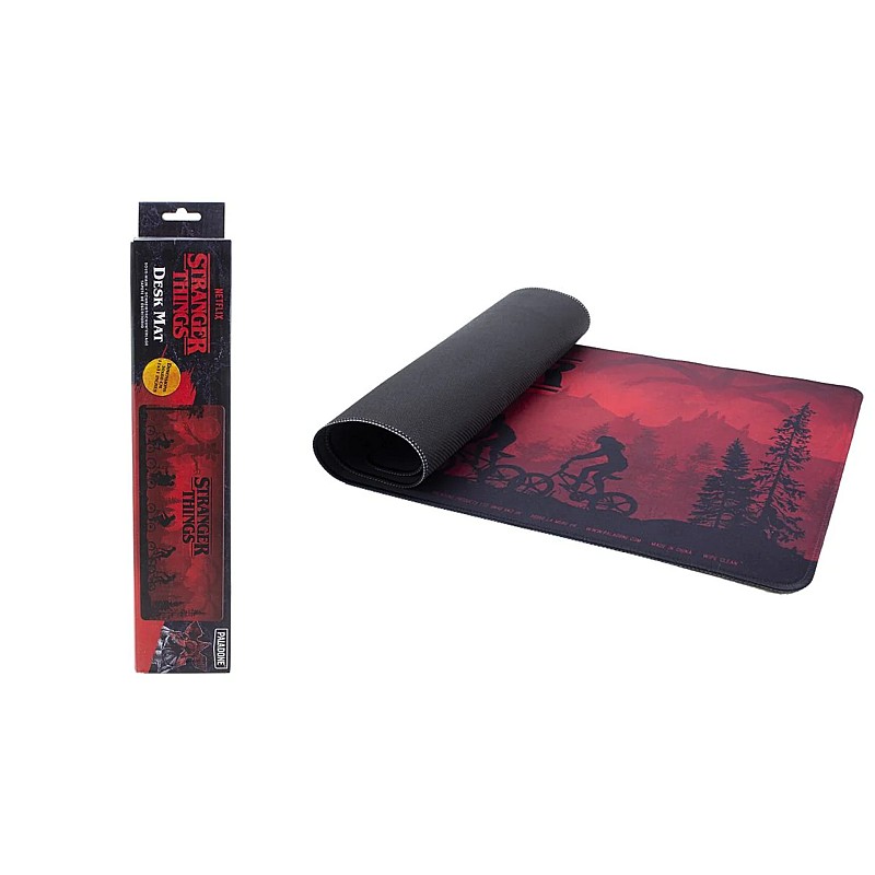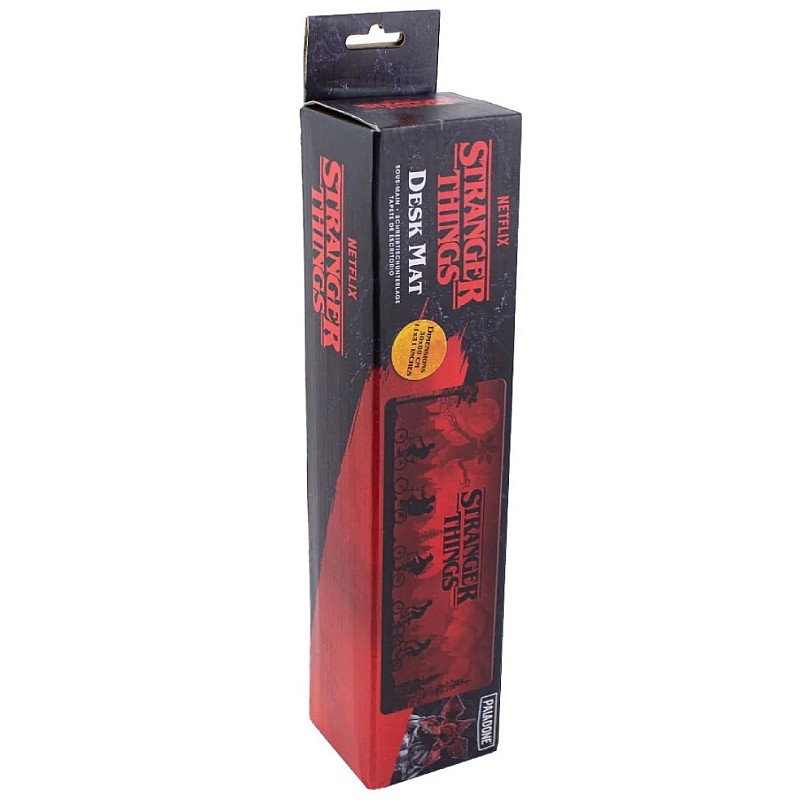 The black and red rubber desk stand features the Stranger Things logo in front of a rural Hawkins scene.