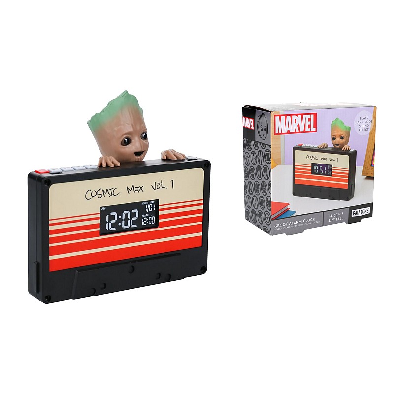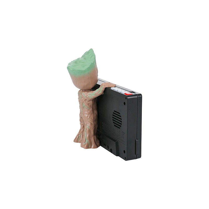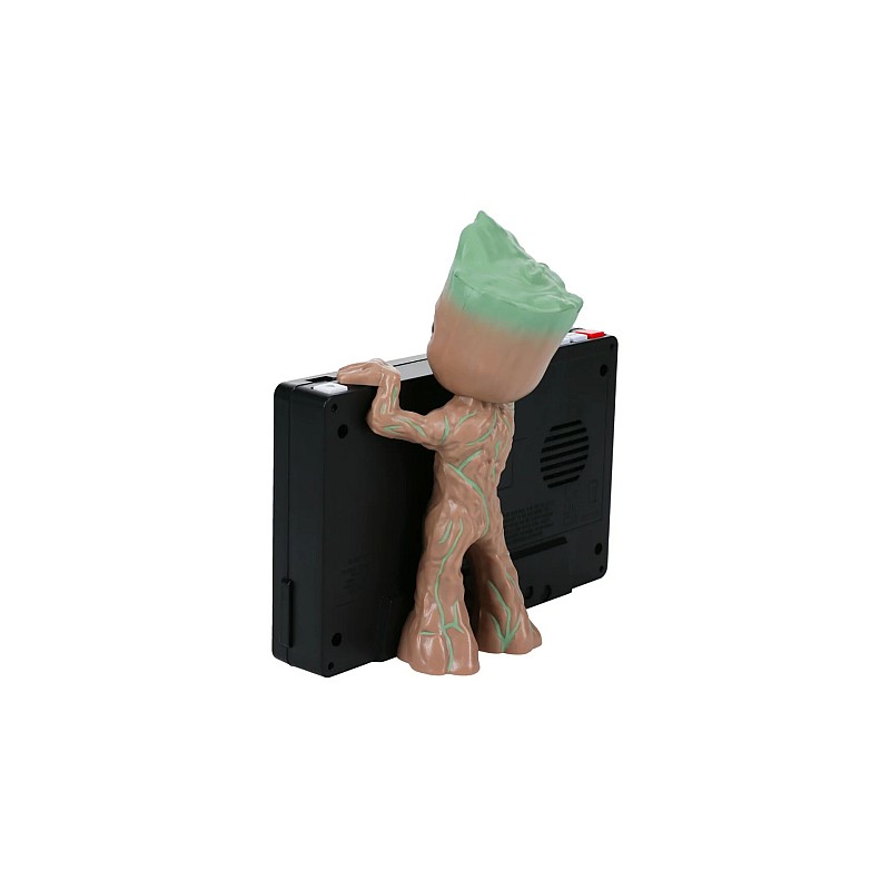The alarm clock is designed to look like Baby Groot leaning on a cassette.