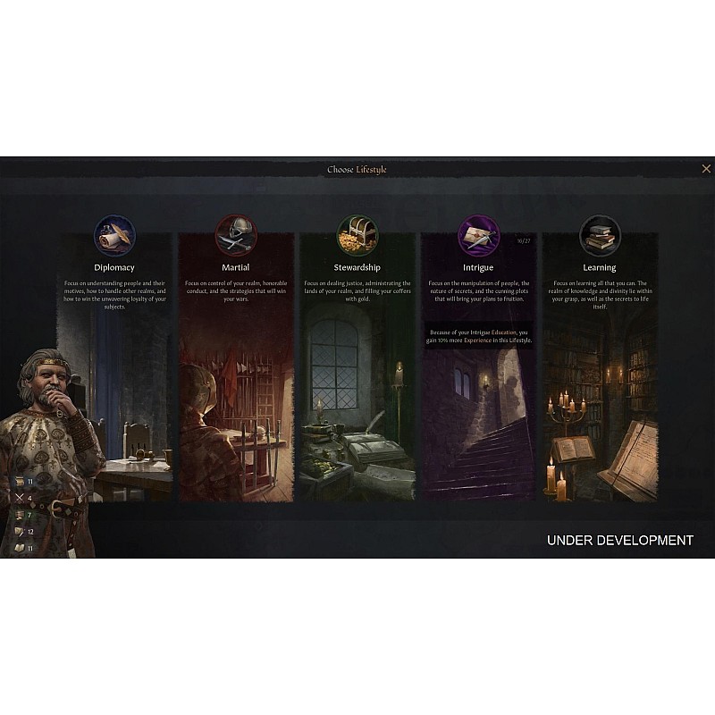 Adopt one of five different lifestyles, improving your skills in the military strategy or in the management of the kingdom.
