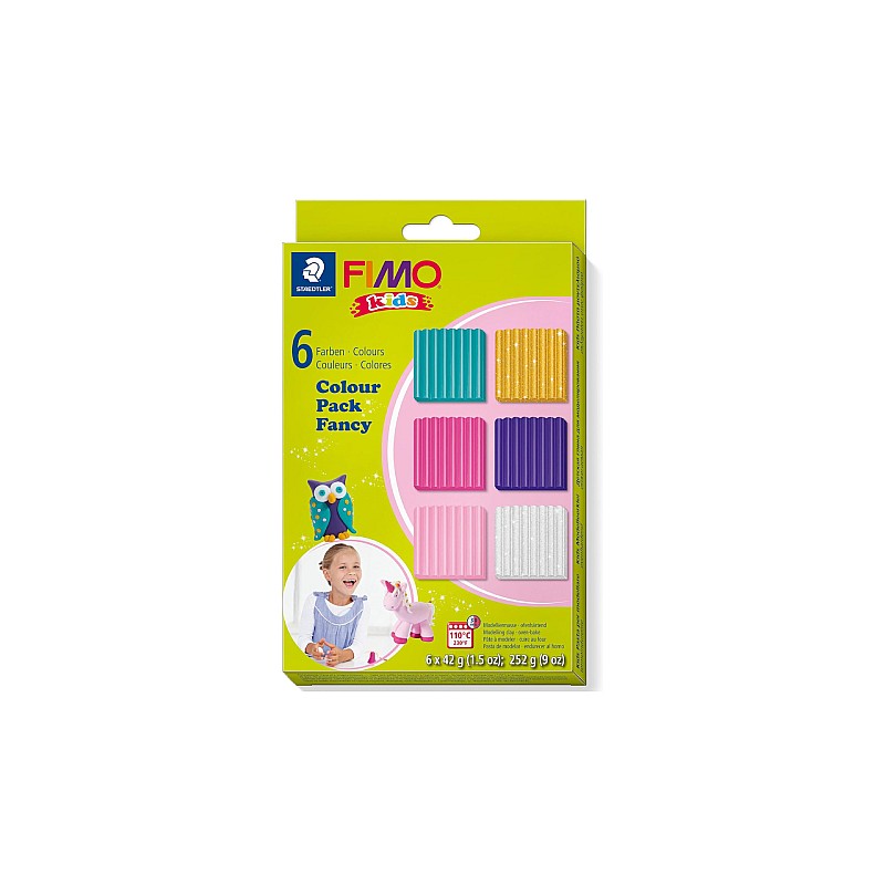 The Staedtler Fimo Kids Color Pack Basic contains 6 blocks of soft modeling clay in basic colors.