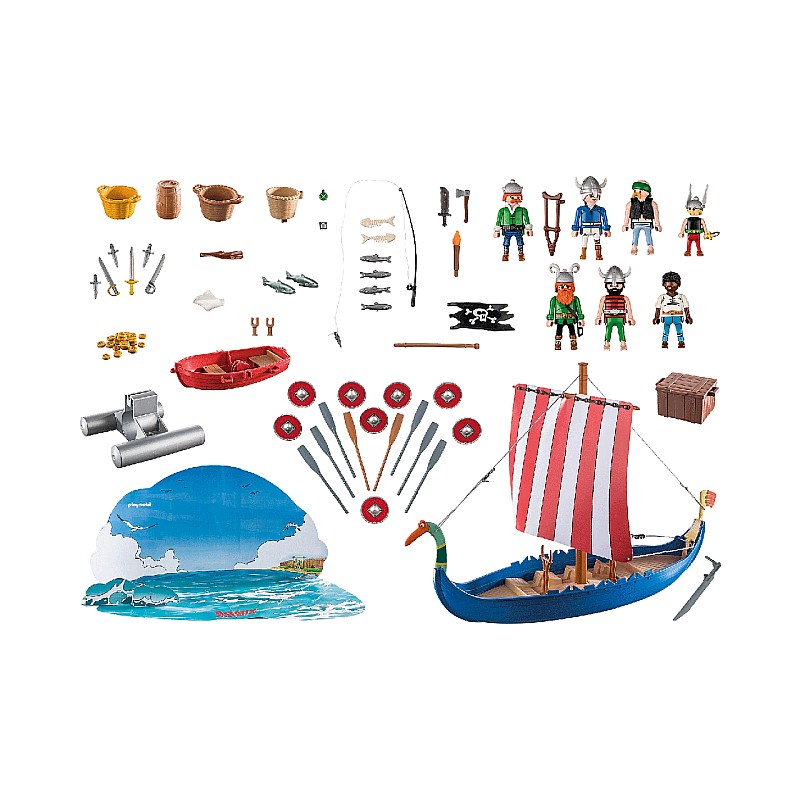 The set includes: an Asterix Christmas calendar with 24 surprises based on the popular comic characters with Asterix and Anticlimax, five pirates, a pirate ship with a crow's nest, a rowing boat, a fishing rod, a fish, numerous accessories and many other interesting extras.