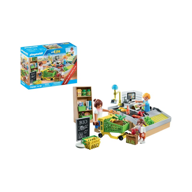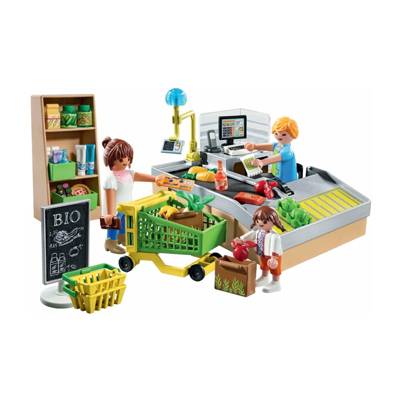 The set includes everything needed for an authentic shopping trip: three figures, a shopping trolley, a shopping basket and a shelf full of products.