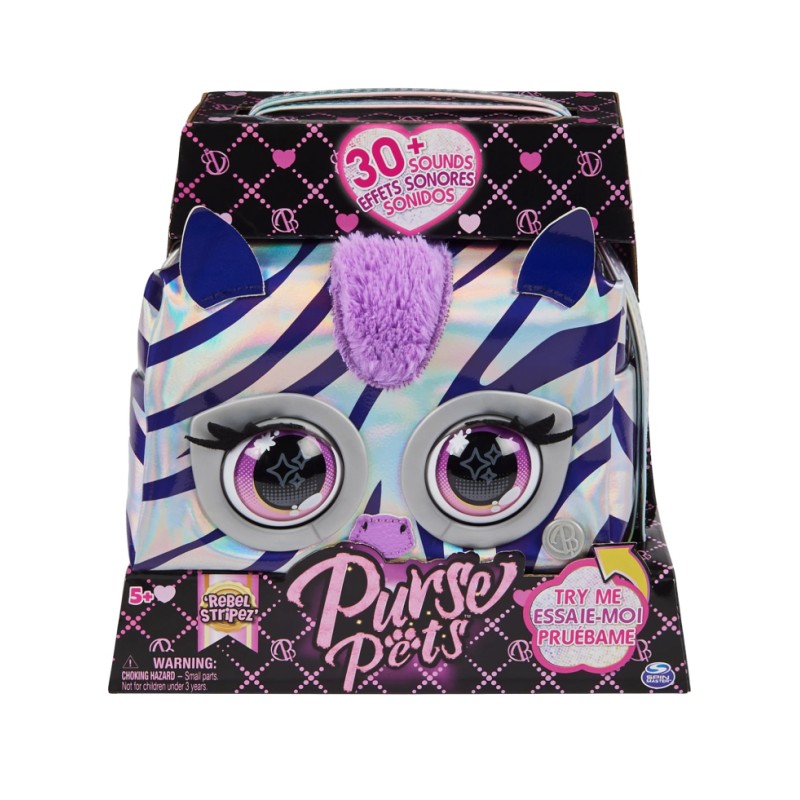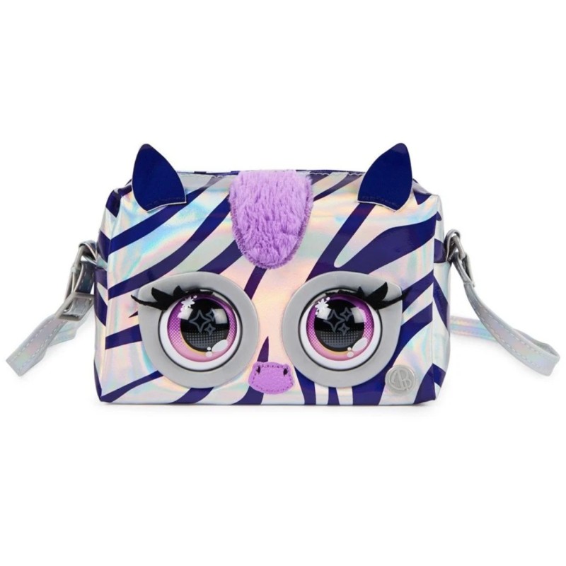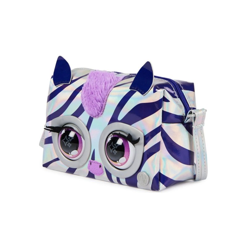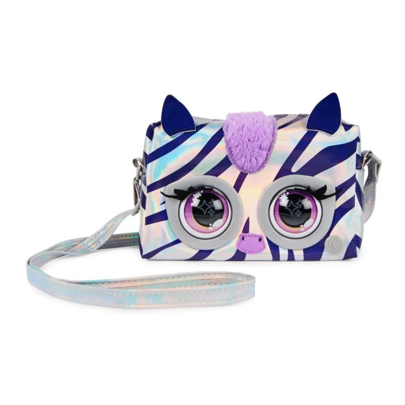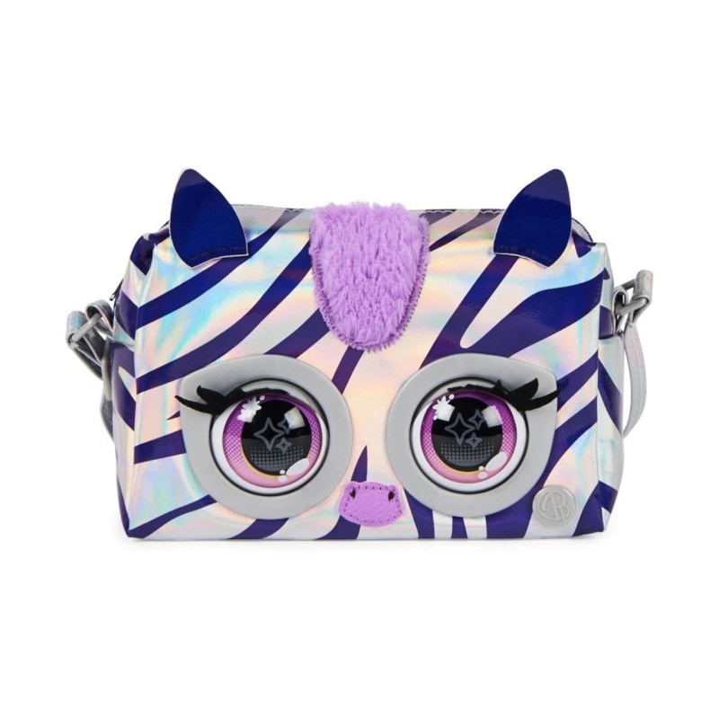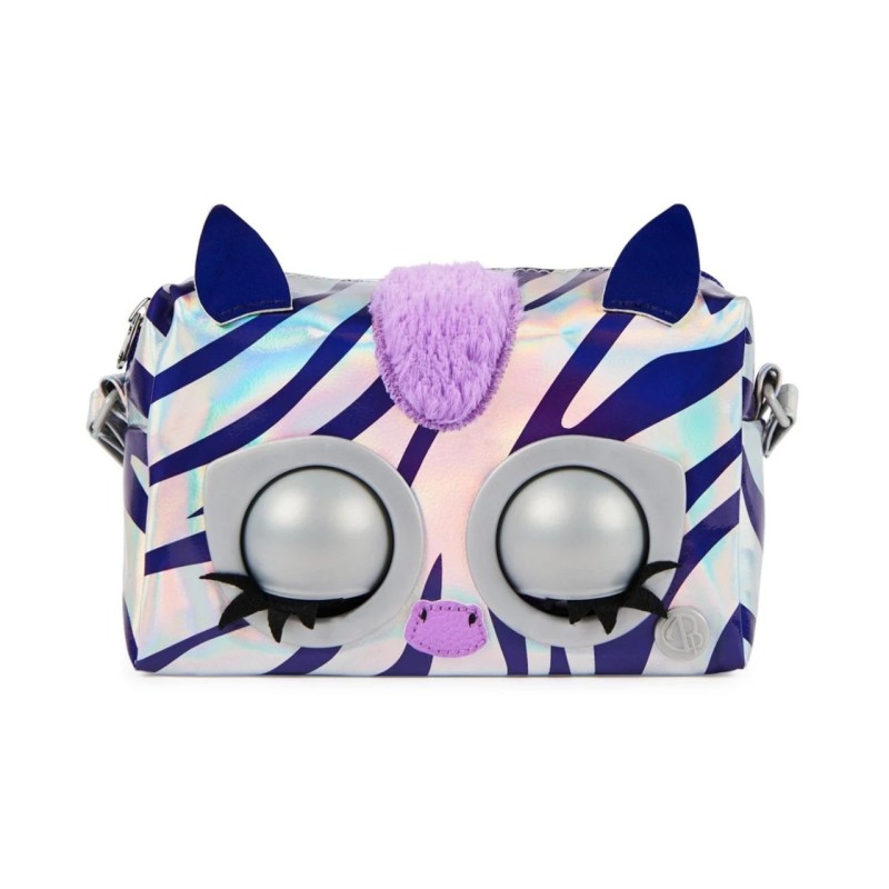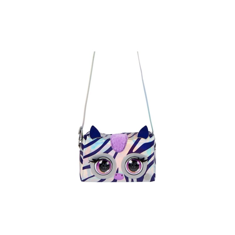 The Rebel Stripe Zebra The Zebra is super bright, featuring a silver fabric with iridescent purple stripes, a fluffy mane, pop-art inspired eyes, metallic hardware and an adjustable metallic strap to wear over the shoulder or as a cross body bag.