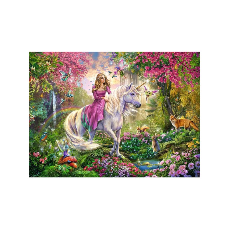 This wonderfully colorful scene is full of emotion and detail. A beautiful fairy tale princess is transported around her kingdom by her trusty unicorn.