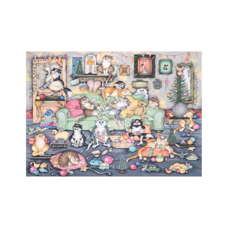 Step into a whimsical wonderland with this puzzle that captures the festive chaos of Christmas in a cozy living room full of crazy cats.
