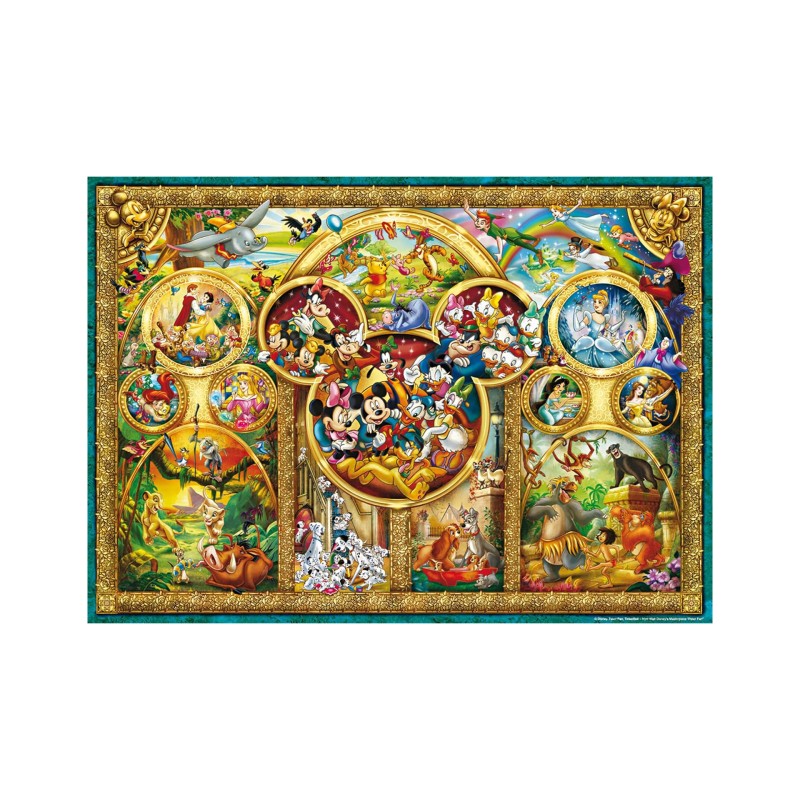 This delightful 1000-piece jigsaw puzzle features a unique gathering of everyone's favorite Disney characters throughout time.