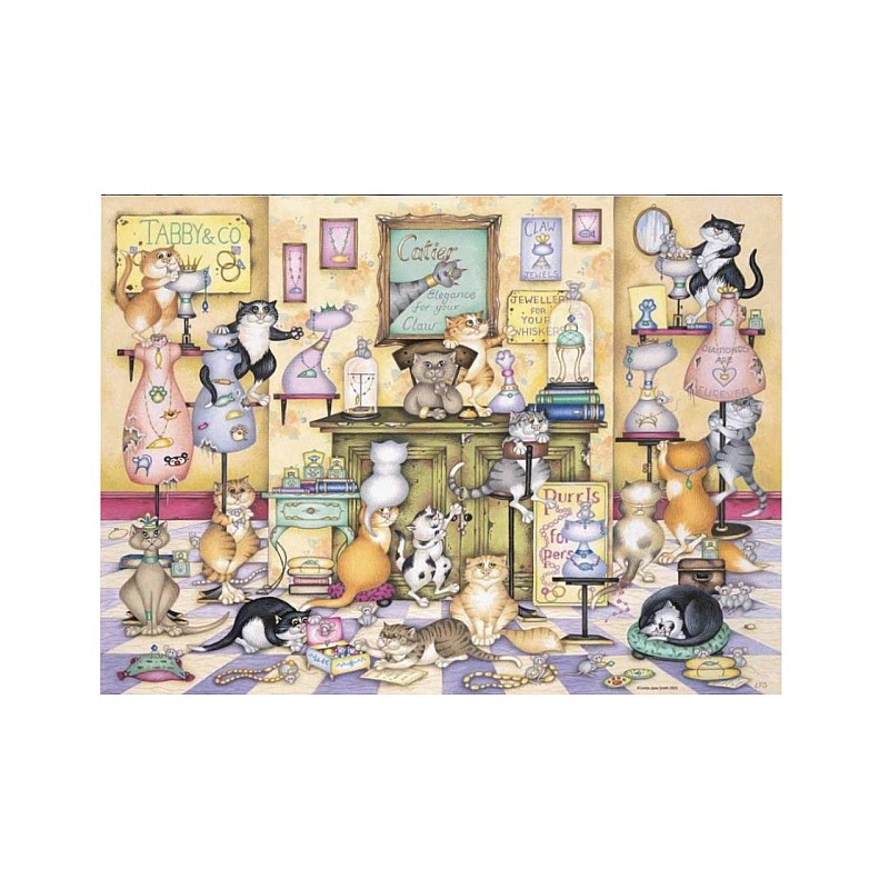Stand up on an eccentric journey with this 500-piece Jigsaw puzzle, in a tumultuous painting of crazy cats, enigmatic mannequins, dazzling jewelry and wicked mice.
