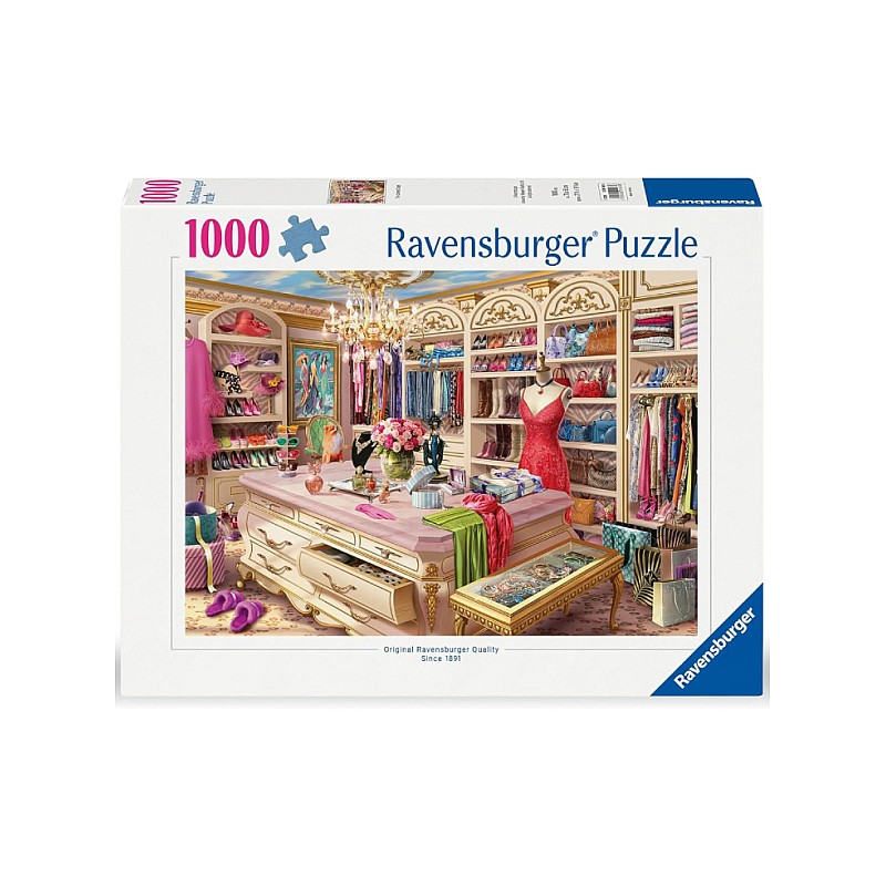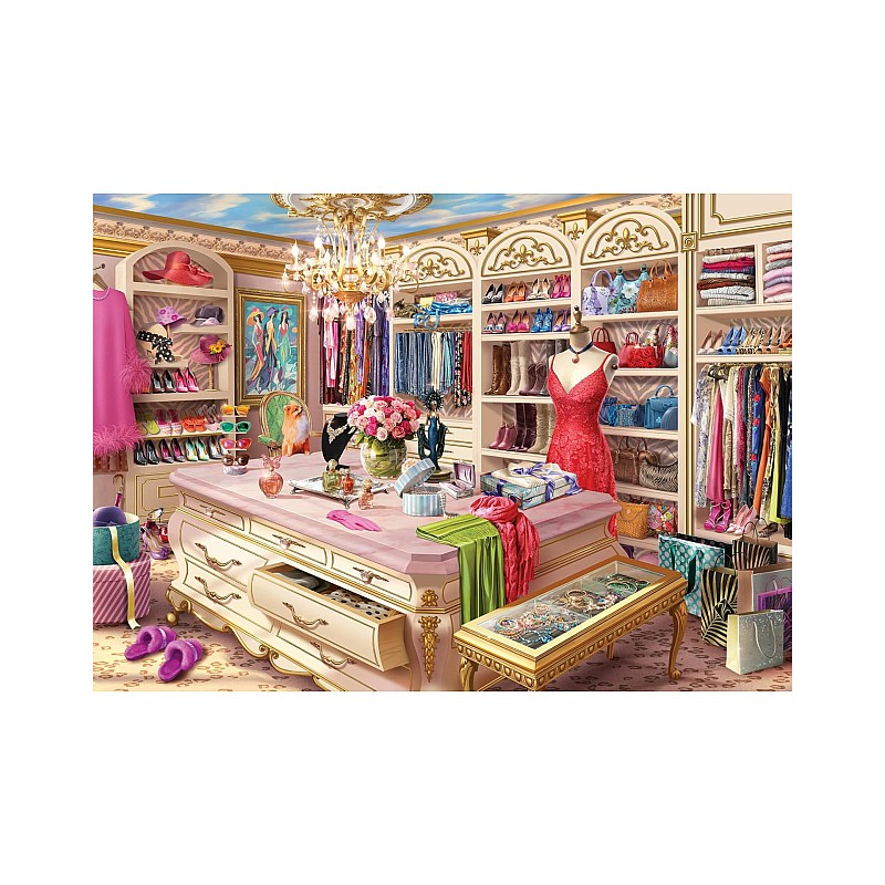 Ravensburger The Coveted Closet is a high quality puzzle, with a spectacular image of a sophisticated dressing, full of luxurious accessories and collection objects.