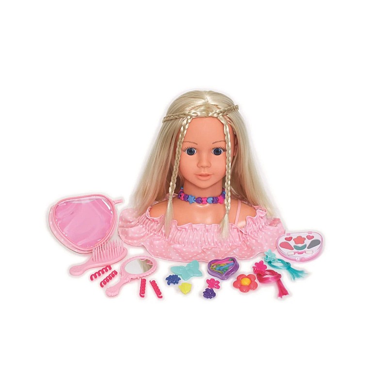 UniQ Blonde real hair and makeup head with brush, mirror and smart accessories hair and makeup set in box.