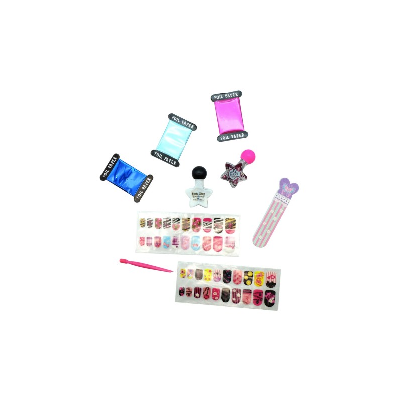 Includes 4 colored foils, 40 nail stickers, 1 nail glue, 1 nail polish, 1 applicator and 1 nail file