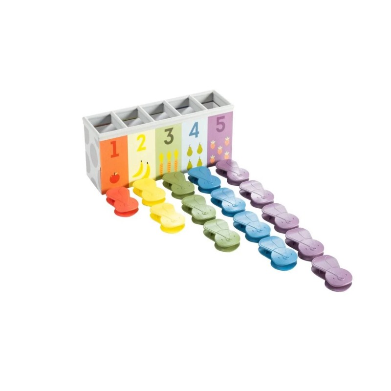 From 24 months, the child matches the clips with the colors on the box. From 30 months, the baby will be able to sort the clips by color and will learn to count them.