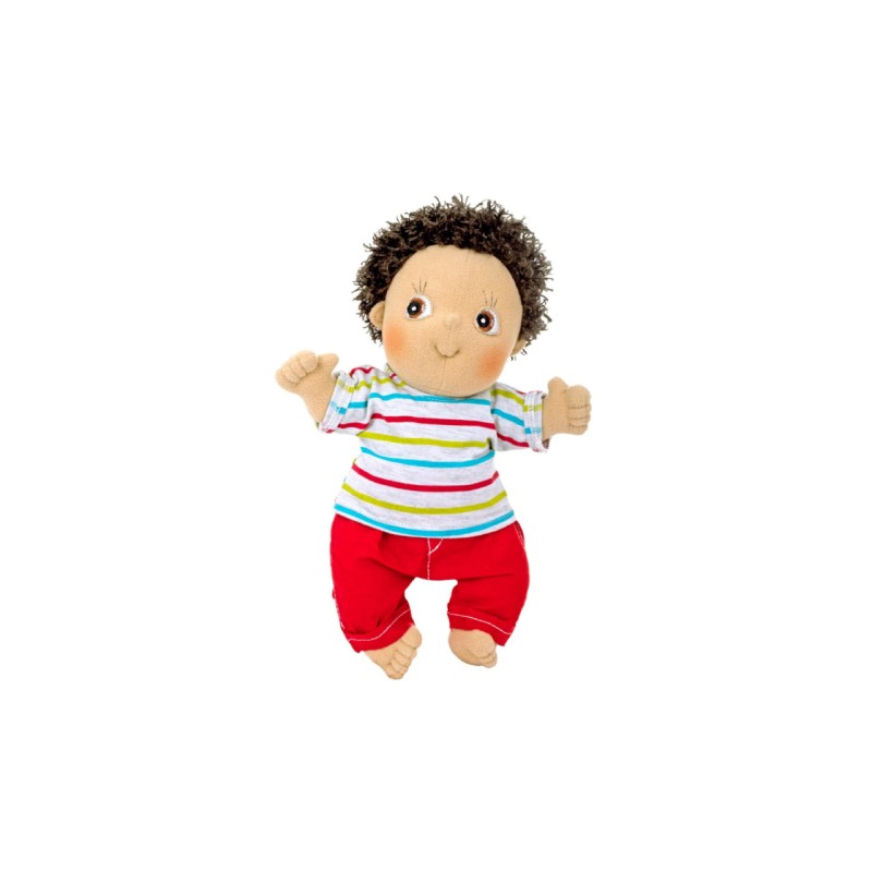 Cute Rubens "Charlie" barn doll with black hair and brown eyes, wearing a white shirt with colorful stripes and a pair of red pants.