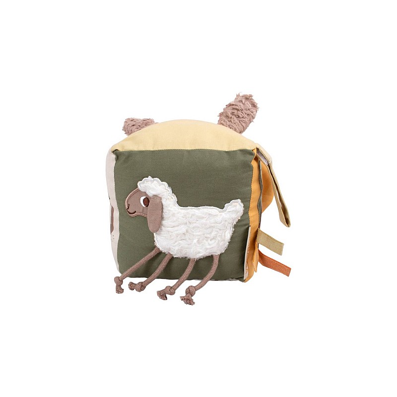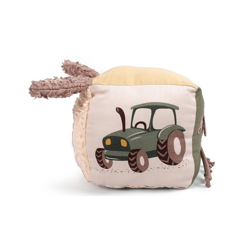The soft cube is designed with different elements on each side, with lots of tractors and cute farm animals in green and earth tones.