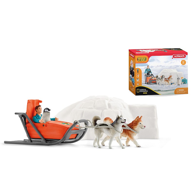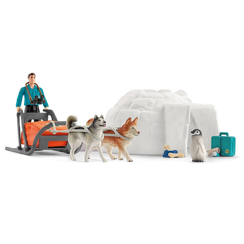 Includes: Forester Tom, 2 huskies, baby emperor penguin, tableware, suitcase, food bowl, 2 bones, bandage, binoculars, salve, dog sled with screen, igloo with slide, sticker sheet.