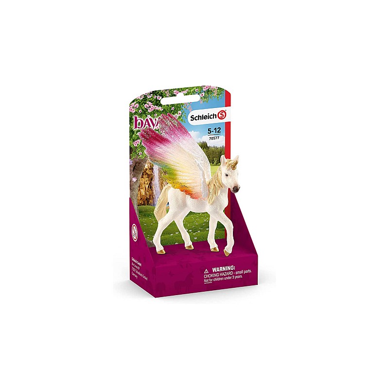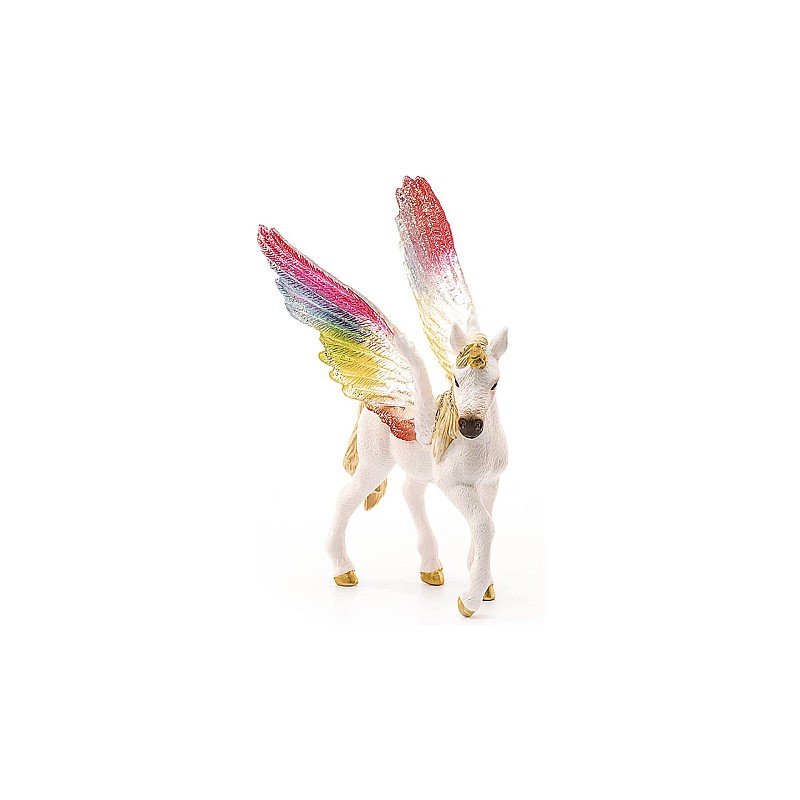 Schleich Winged Rainbow Unicorn, Foal (70577) is a detailed and stunning figure from the Schleich collection, depicting a winged unicorn foal in rainbow hues.