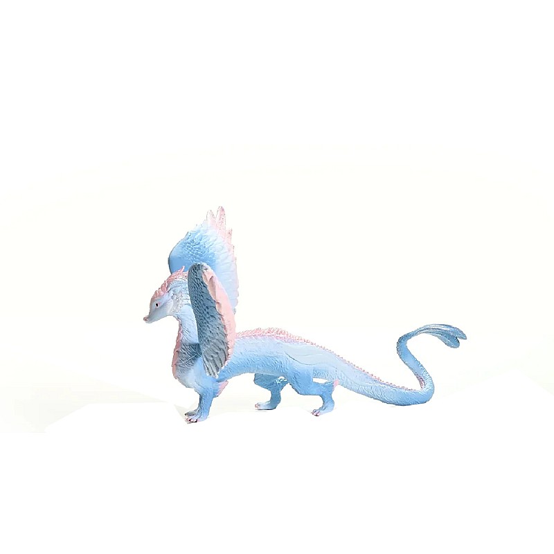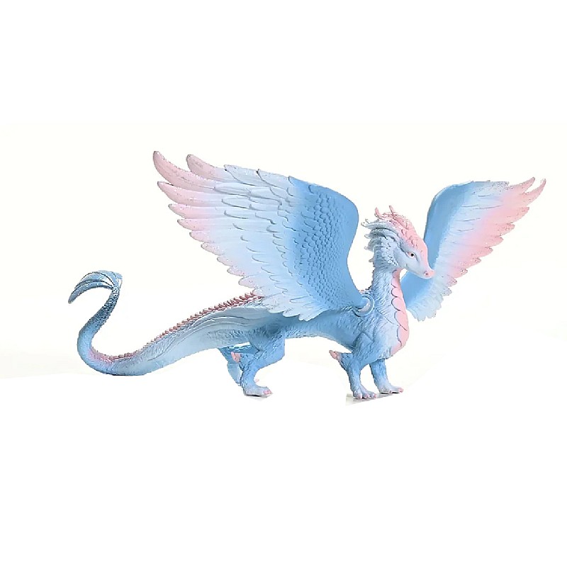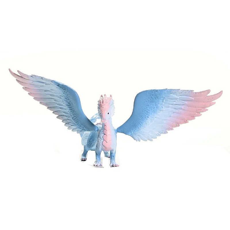 A crystal dragon looks impressive as it stretches its strong blue wings with the pink tip.