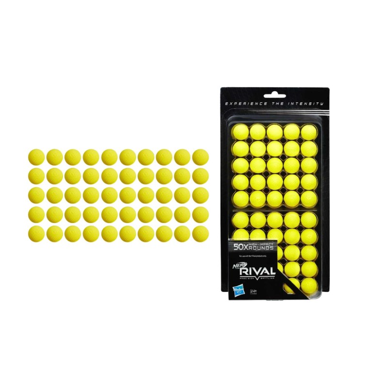 Each high-impact cartridge in this 50-pack of refills works with Nerf Rival blasters.