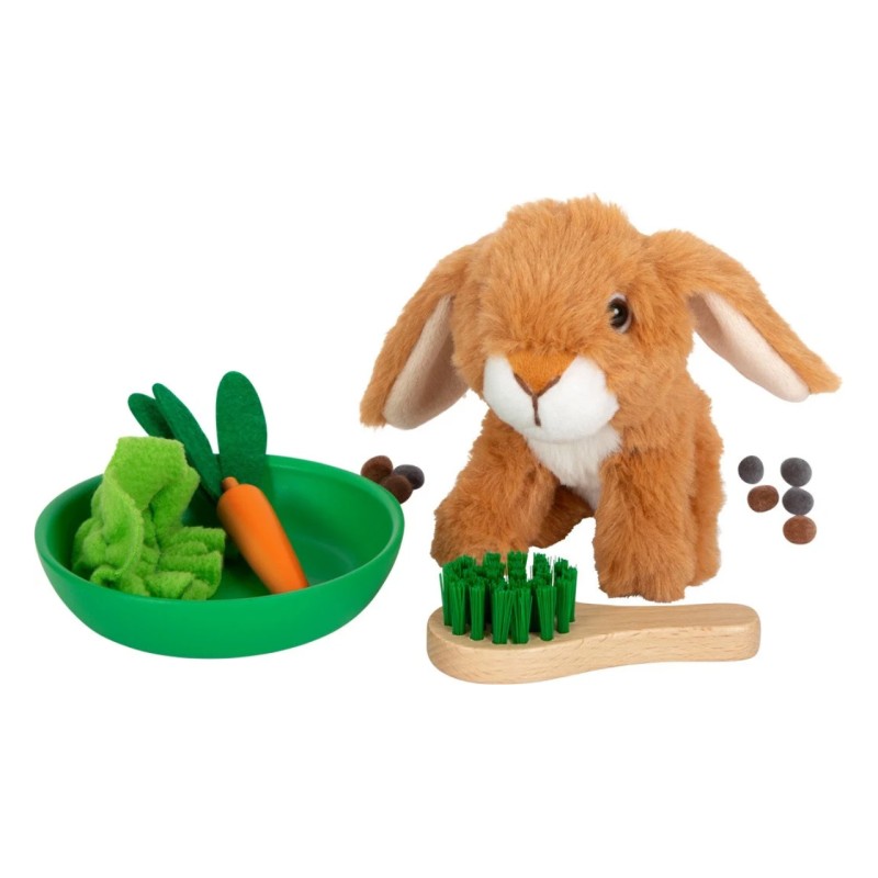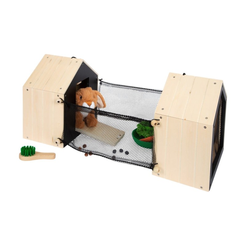 Two mesh fences can be connected to the cages to create an outer enclosure area. Incl. Rabbit, brush, small bowl, wooden and felt carrots, as well as a piece of salad and pieces of rabbit droppings.