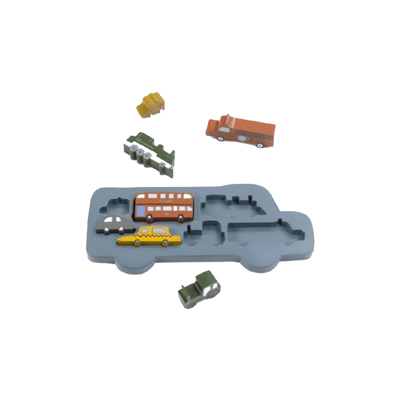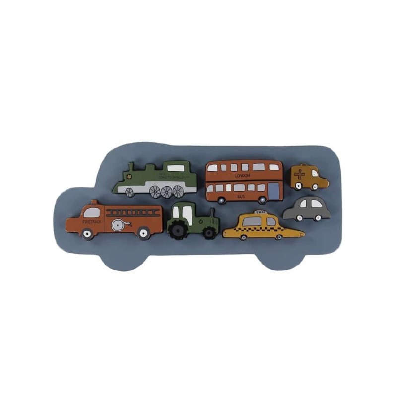 The puzzle board is shaped like a bus. The puzzle helps promote the child's logical sense, fine motor skills and understanding of shape and size.