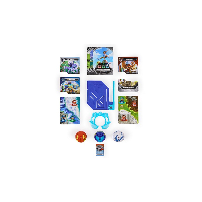 Spin up your Bakugan with the new custom Starter 3-Pack Bakugan. This Bakugan set comes with 1 Special Attack (Spinning) Bakugan, 2 Basic Bakugan, a Rip Card, an XL Rip Cable and more cards.