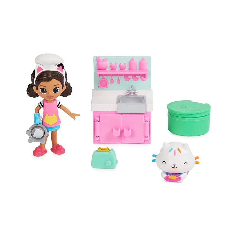 This fun toy set includes a collectible Gabby Girl figure, Cakey Cat, kitchen sink furniture, plus a dollhouse delivery box with a surprise kitchen accessory inside!
