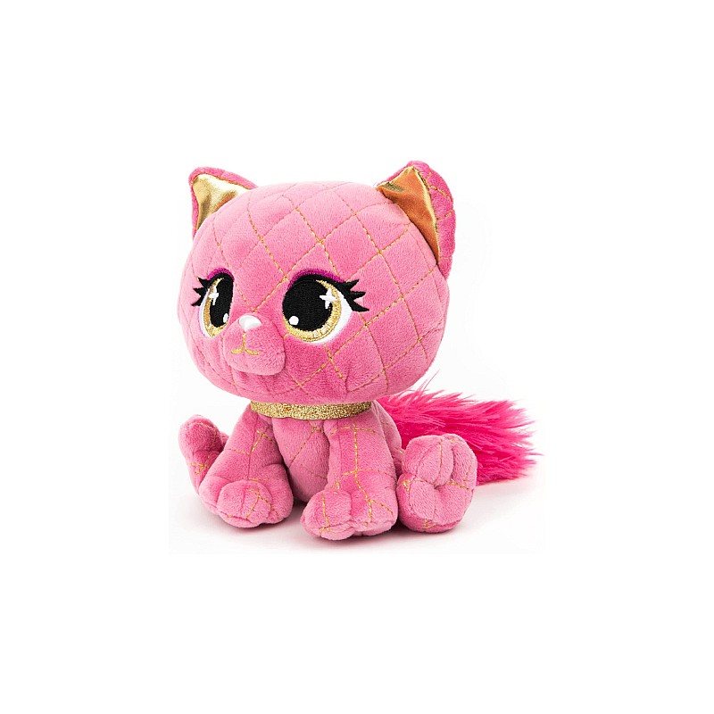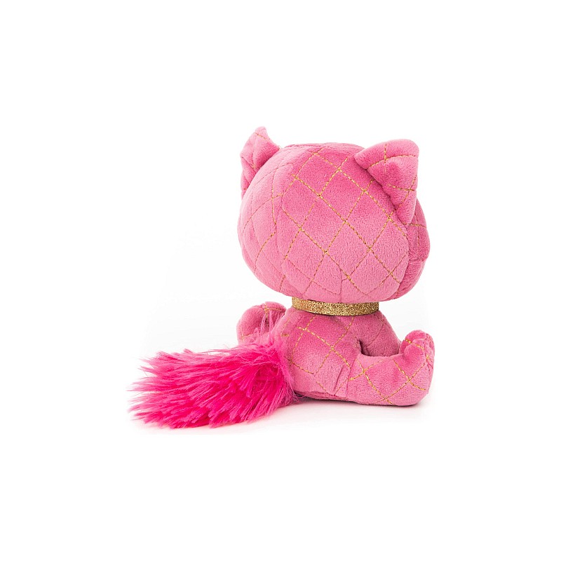 A gorgeous pink plush cat, she shines on the fashion scene with gold embroidered accents all over, complete with sparkling eyes and ears.