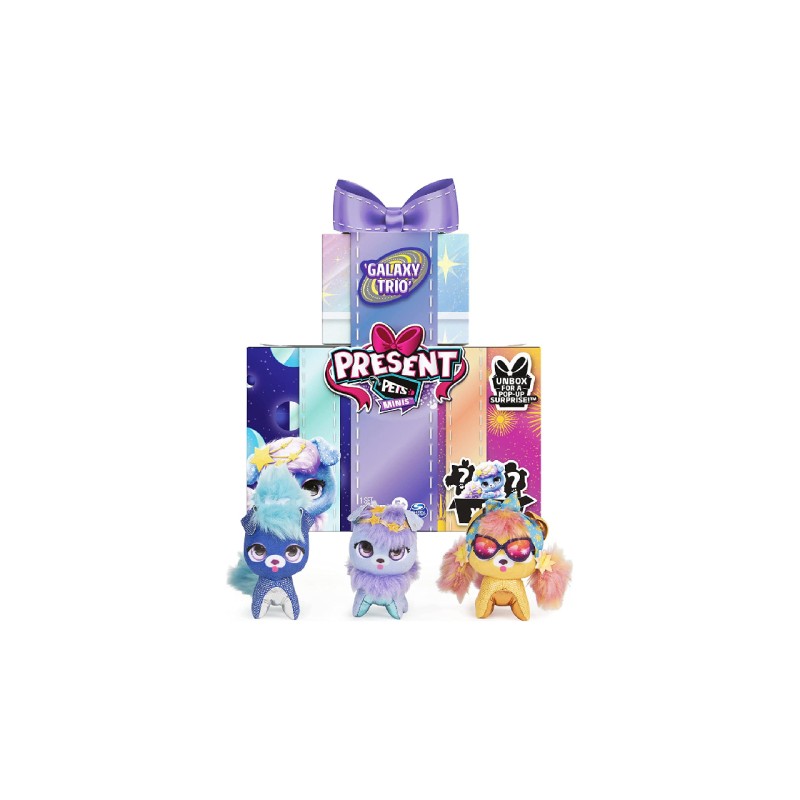 Live three times the joy with the Set of 3 Present Pets Minis Galaxy Trio! Present Pets Minis are adorable stuffed animals that include an amazing reveal!