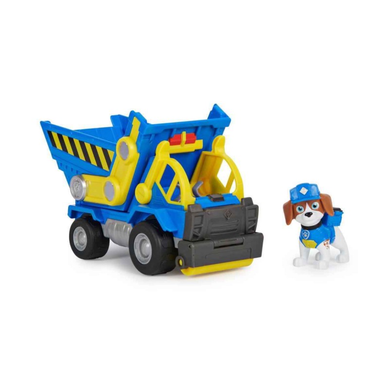 This toy is a garbage truck with the theme of the character Rubble, one of the most beloved dogs of the Paw Patrol team.
