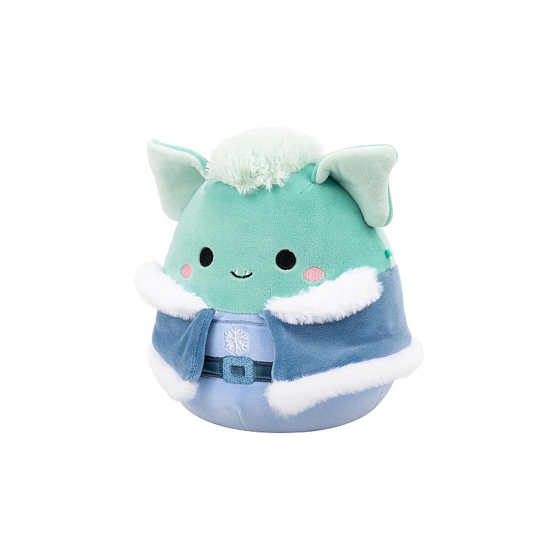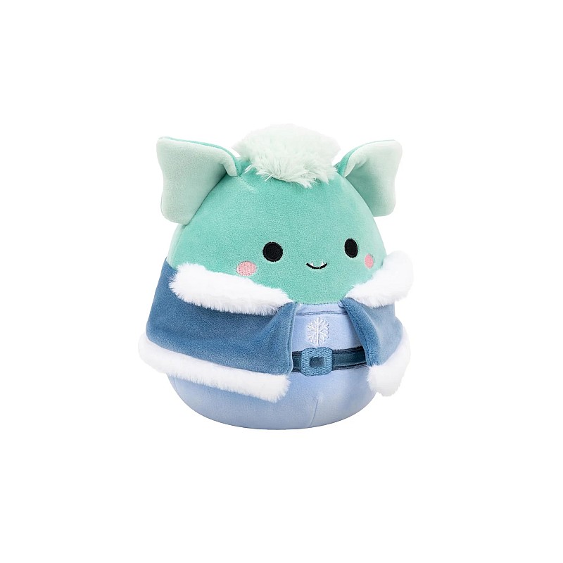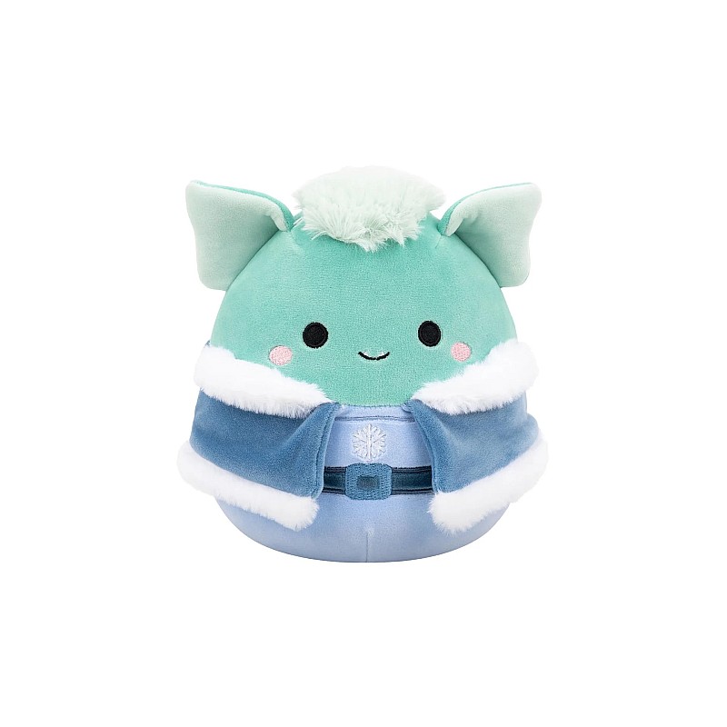 Cute Troll Squishmallows Troll Toy in mint blue with light blue clothes and cape in a cozy Christmas theme.