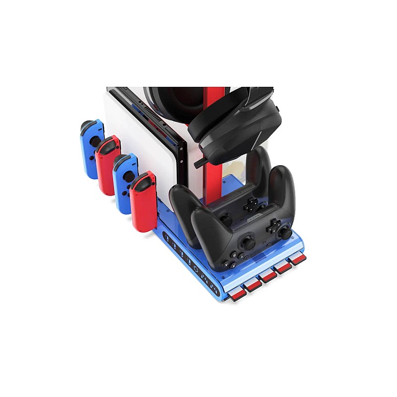 Powered by the Switch AC adapter (not included), this multifunctional space-saving stand allows you to charge your game controllers and store your console, games, controllers and accessories.