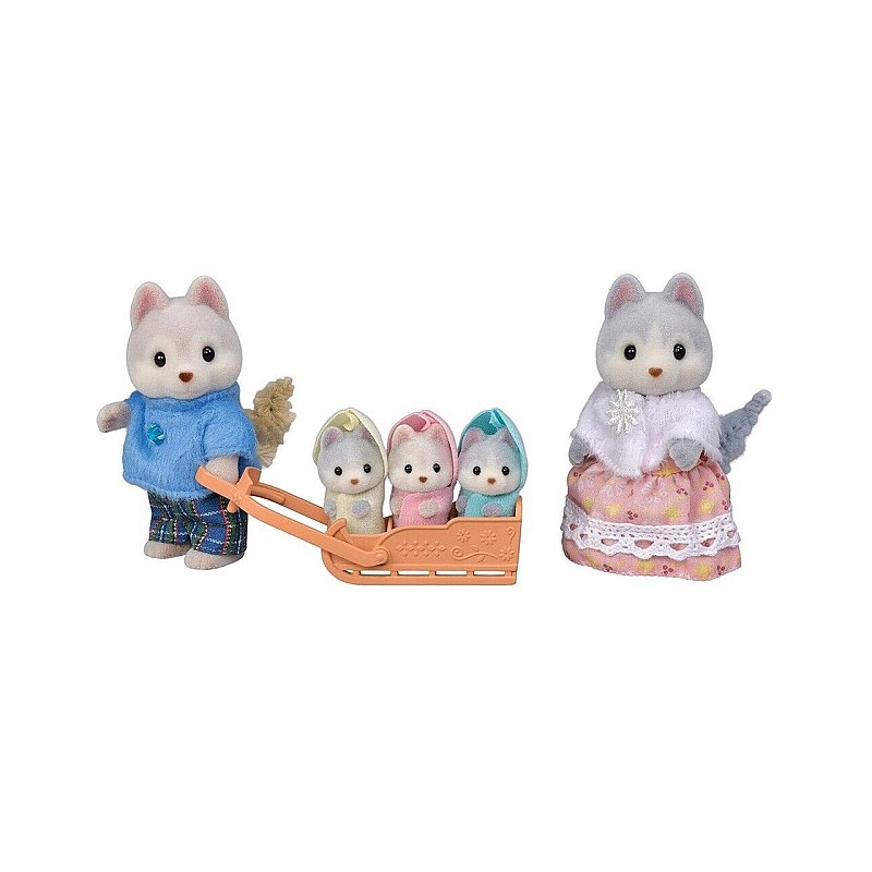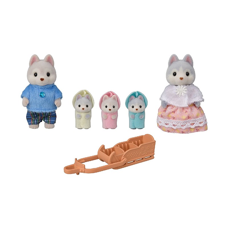 The Husky Family set contains five figures: father Vincent, mother Avril and triplets Rae, Drake and Nelly, as well as a sled for the triplets. The figures have beautiful gray and brown fur.