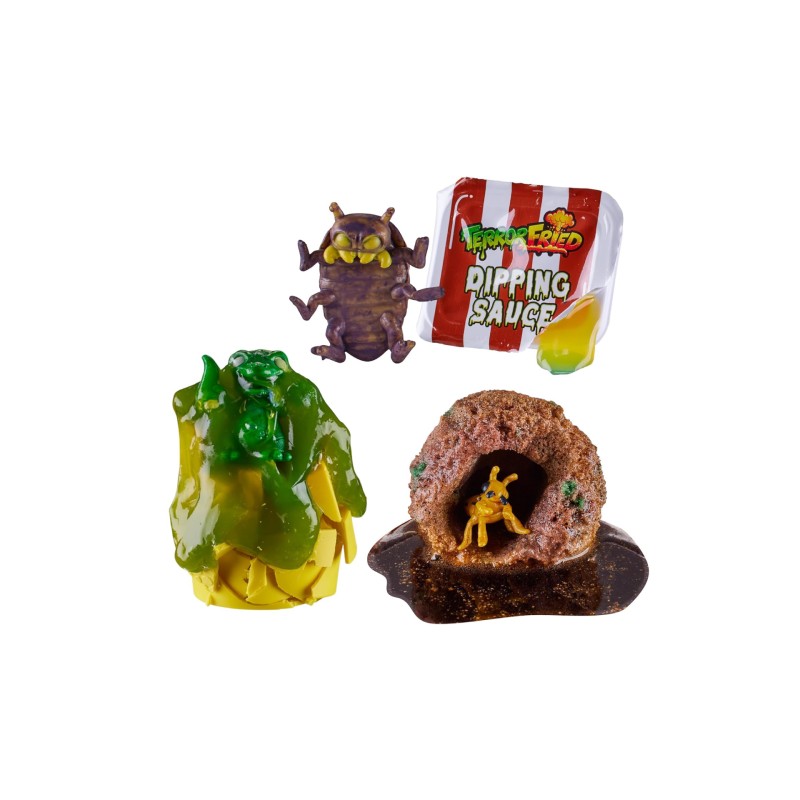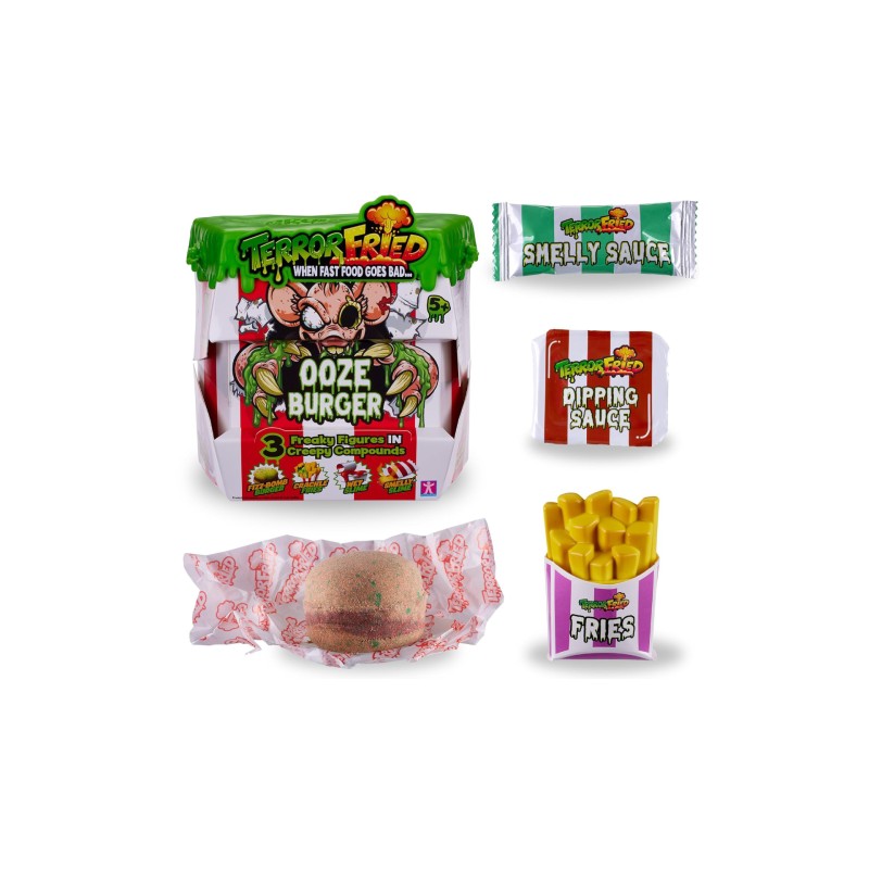 Unpack 4 different compounds (burger, fries and two types of slime) to reveal 3 strange figures.