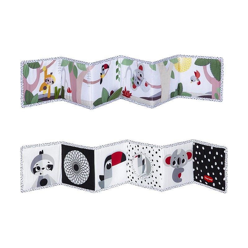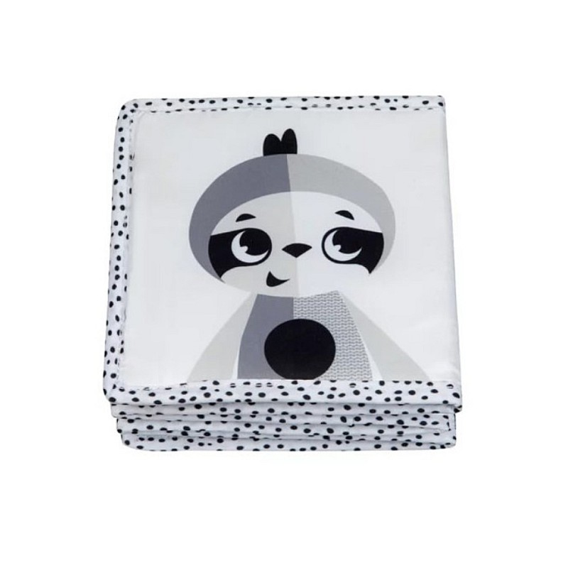 This two-faced baby baby book, with a black and white face and the other in soothing neutral colors, can be comfortably attached to the trolley and stimulates the baby's development.