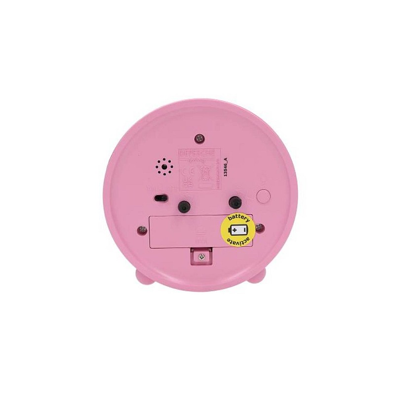 The round alarm clock, pink, plastic, has a gorgeous double motif and cute, feminine icons on the dial.